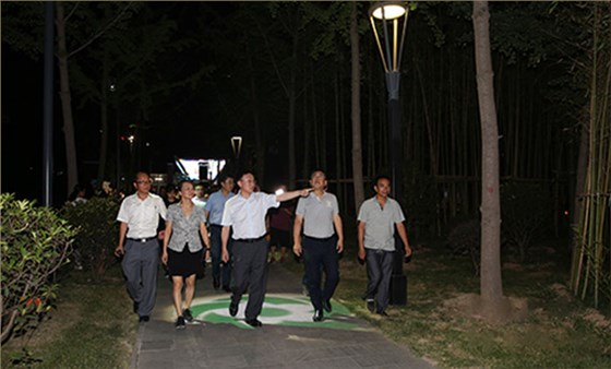 首先考察組一行來到唐城墻遺址公園北廣場,高新區夜景照明及唐遺址公園燈光秀的總設計師、北京信達電通科技董事長王春龍先生給眾領導講解由信達電通設計策劃的高新區夜景亮化提升方案。