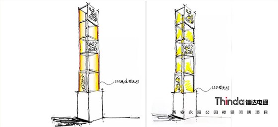 風(fēng)車景觀架現(xiàn)有底部投光照明,效果不理想,光溢散嚴(yán)重,建議逐層安裝小投光燈,將風(fēng)車打亮;