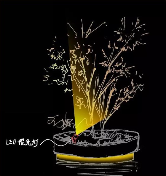 綠植景觀柱依據(jù)其構(gòu)造,進(jìn)行分層照射,在燈具上采用小型投光燈將基座和頂部綠植部分分層打亮,頂部架投影燈營造氛圍照明;