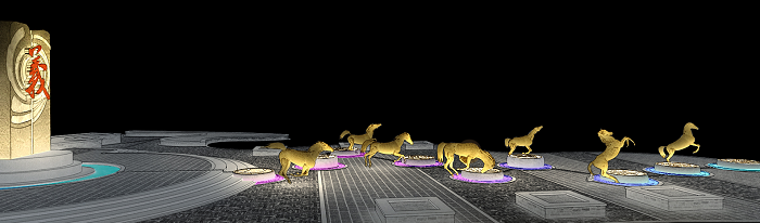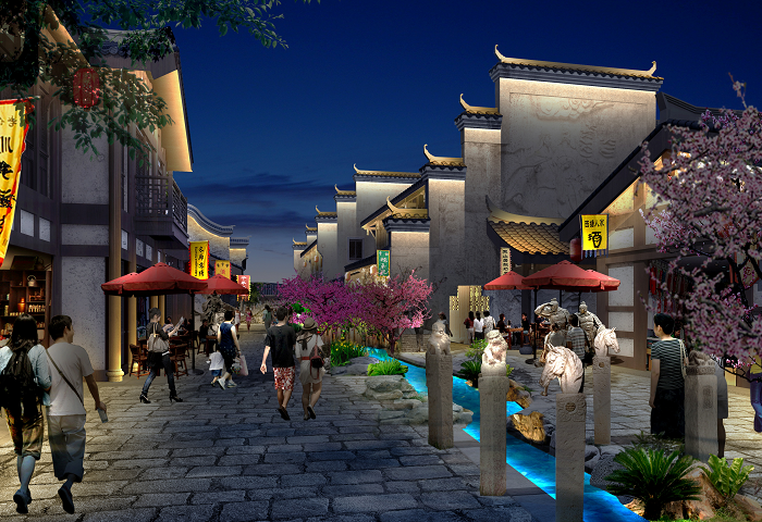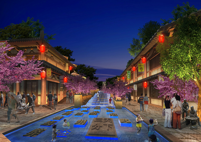 信達電通根據忠義街布局、載體特點,對整體夜景進行規劃,并對建筑、廣場、雕塑、水體、景觀、道路等載體進行具體設計,打造一場互動體驗式的三國主題度假休閑之旅。