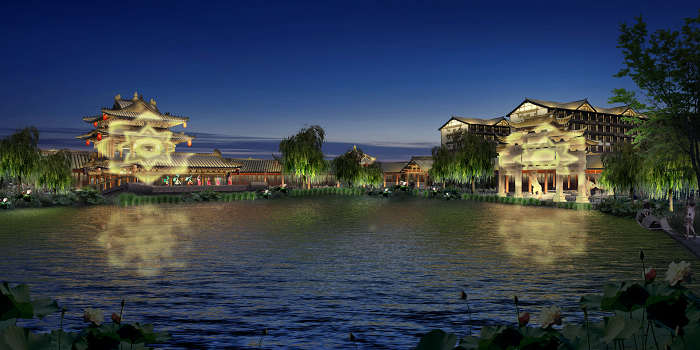 古鎮仿古建筑較多,仿古建筑以暖光色為主,強調建筑細節,幽靜典雅。以萬壽塔為例,萬壽塔始建于明朝,至今已有四百余年。其照明的前提是以保護為前提,不在古塔上安裝燈具,而是在古塔四周立桿投光。所投內容與古塔本身的歷史滄桑感結合,《出師表》、漢文化元素、龍、太極元素等,值得游客慢慢品味與欣賞。