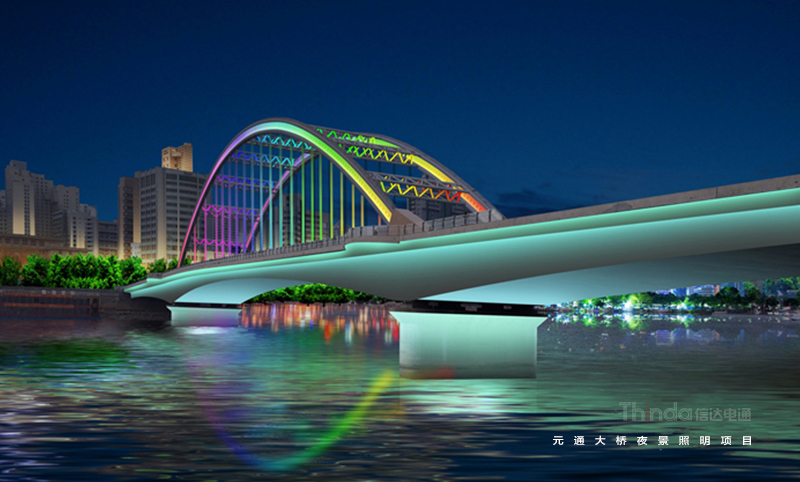 元通大橋北起靖遠路高架橋,主跨跨越黃河,全長459米,屬于城市次干路。信達聯合橋梁照明設計師對元通大橋進行全面調研定并針對橋梁功能、夜景需求進行設計,設計手法動靜結合,簡單與復雜、精致與粗獷、明與暗、虛與實、冷與暖在燈光中體現。