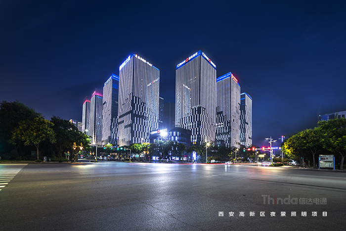 泰華·金貿國際位于西安高新區金融圈與商務圈的交匯地帶,與唐城墻遺址公園僅一路之隔。有西安首創山水云陶筑玻璃幕墻,高端商務會所,啟封現代商務的新風范。信達根據辦公樓的戶外亮化照明設計要素和泰華·金貿國際建筑景觀特點以及所處的地理位置,對泰華·金貿國際進行戶外亮化照明設計改造工作。改變了泰華·金貿國際之前的色系昏暗現狀,增加了建筑的外立面整體效果及廣告照明的效果,洗亮泰華·金貿國際建筑頂部,凸顯天際效果,使泰華·金貿國際成為西安夜色下一道亮麗的風景。